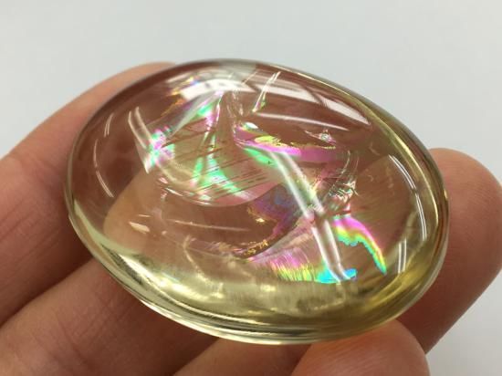 そのレモンクォーツの内部のごく薄い裂け目(クラック層)に生じた、光の干渉現象で現れた虹色効果(イリデッセンス)をもつものは、レインボー・クォーツと呼ばれて人気が あります。