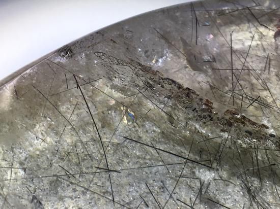 対して、ブラックルチルクォーツは、光に透かすとほんの少し赤茶色に見えます。
